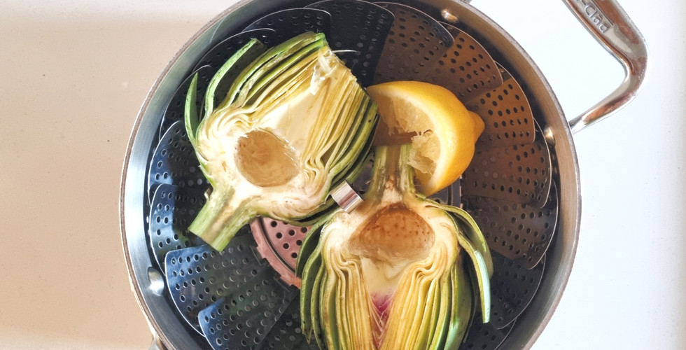 Placez les moitiés d'artichauts et un demi-citron dans le cuit-vapeur. Couvrez et laissez cuire à la vapeur pendant 15 à 20 minutes, ou jusqu'à ce qu'un couteau s'insère facilement dans la tige.
